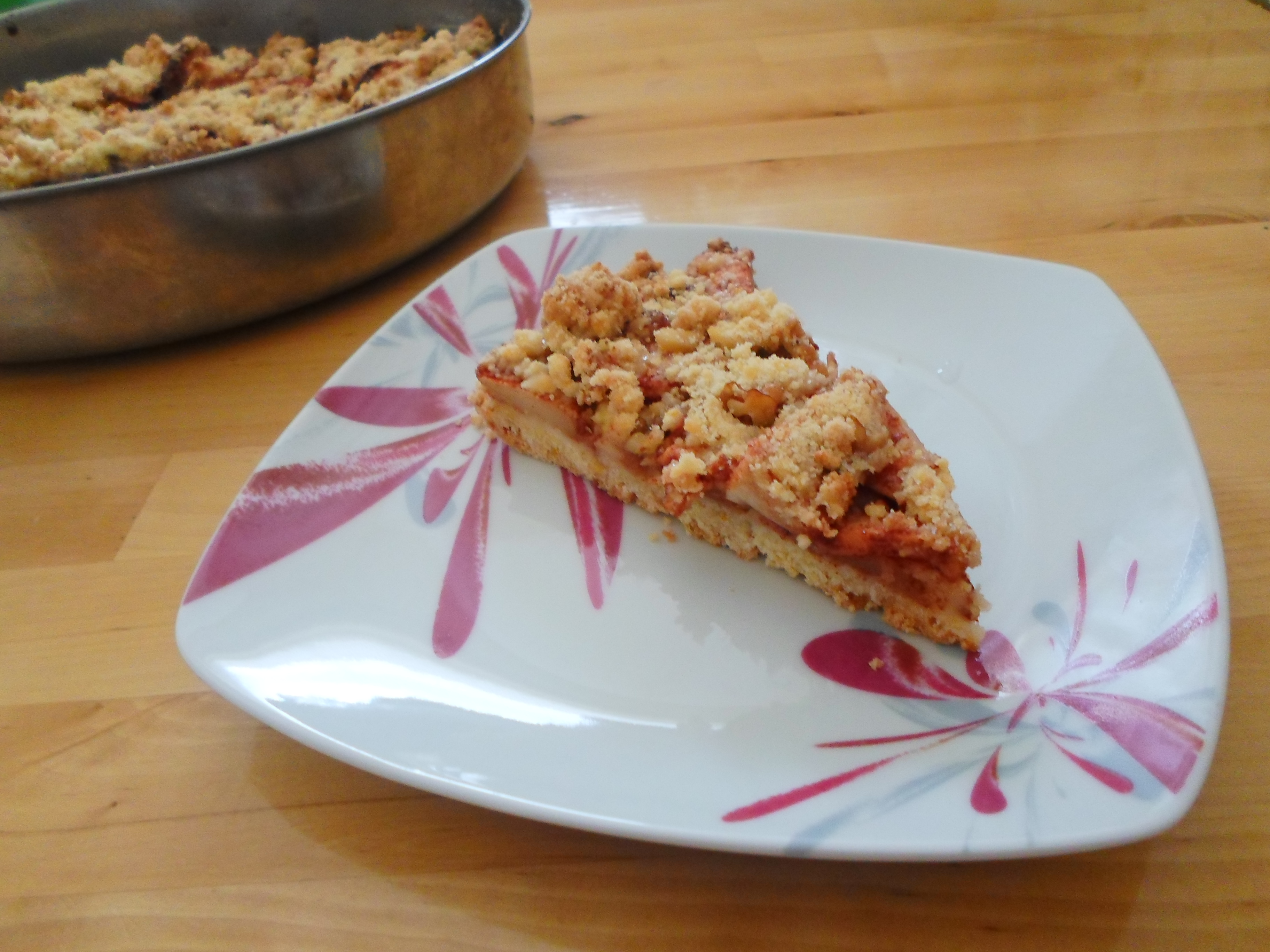 Take a round baking pan and cover it with some butter. Put in half of the crumble dough, then the apples’ mixture and cover with the other half of the dough.