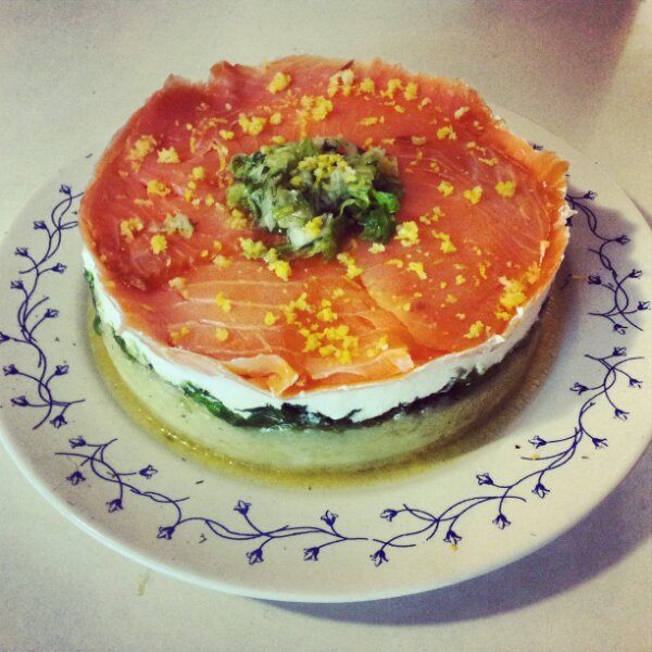 Place a medium sized springform pan on a plate and spread the potatoe puree as the first layer. Spread the lettuce mixture as the second layer and carefully spread the cream cheese as your third layer. Finally place evenly the salmon slices and decorated with some lettuce or dill. Sprinkle the lemon Zest on top.
