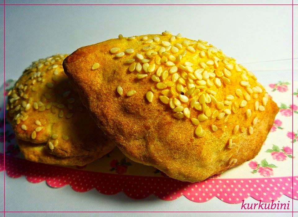 In a bowl we mix the flour, parmesan cheese, butter, milk and one of the eggs. We work the mixture until it turns into an elastic dough. We add milk or flour depending on whether it is too dry or moist. We let it aside to rest and we grate the feta cheese and mix it with a bit of olive oil. Take a small fist of dough and work it into a flat circle. Place some feta in the middle and close it so that you form a crescent. When we have formed all the cheese pies we beat the other egg and dilute it with a bit of water. Brush the pies with the mixture and sprinkle with sesame.